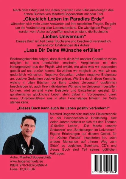 Nach dem Erfolg und den vielen positiven Leser-Rückmeldungen des ersten Buches von Manfred Bogenschütz mit dem Titel"Glücklich Leben im Paradies Erde"wünschen sich viele Leser Antworten auf Ihre speziellen Fragen. Es geht um die Veränderung aller Lebensbereiche. Die wichtigsten Fragen wurden vom Autor aufgegriffen und so entstand die Buchserie "Liebes Universum"Dieses Buch ist Teil dieser Buchserie und beschreibt verständlich anhand von Erfahrungen des Autors"Lass Dir Deine Wünsche erfüllen"Erfahrungsberichte zeigen, dass durch die Kraft unserer Gedanken vieles möglich ist, was unerklärlich erscheint. Vergleichbar mit den Naturgesetzen aus der Physik wird erklärt, wie alles was wir aussenden geballt auf uns zurück kommt. So ziehen wir magisch an, was wir uns gedanklich wünschen. Negative Gedanken ziehen negative Ereignisse an, positive Gedanken positive Ereignisse. Wie Sie durch diese Kenntnis, welche in allen Büchern der Serie "Liebes Universum" ausführlich beschrieben ist, auchIhre individuellen Wünsche im Universum bestellen können, wird anhand vieler Beispiele und Einzelheiten gezeigt. Ein ganzheitliches glückliches Leben steht dabei im Vordergrund, damit unser Unterbewußtsein uns in allen Lebenslagen hilfreich zur Seite stehen kann."Dieses Buch kann auch Ihr Leben positiv verändern!"