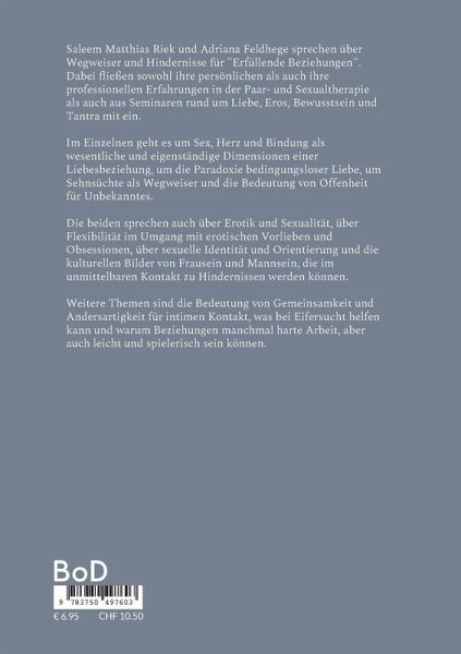 Saleem Matthias Riek und Adriana Feldhege sprechen über Wegweiser und Hindernisse für "Erfüllende Beziehungen". Dabei fließen sowohl ihre persönlichen als auch ihre professionellen Erfahrungen in der Paar- und Sexualtherapie als auch aus Seminaren rund um Liebe, Eros, Bewusstsein und Tantra mit ein.Im Einzelnen geht es um Sex, Herz und Bindung als wesentliche und eigenständige Dimensionen einer Liebesbeziehung, um die Paradoxie bedingungsloser Liebe, um Sehnsüchte als Wegweiser und die Bedeutung von Offenheit für Unbekanntes. Die beiden sprechen auch über Erotik und Sexualität, über Flexibilität im Umgang mit erotischen Vorlieben und Obsessionen, über sexuelle Identität und Orientierung und die kulturellen Bilder von Frausein und Mannsein, die im unmittelbaren Kontakt zu Hindernissen werden können.Weitere Themen sind die Bedeutung von Gemeinsamkeit und Andersartigkeit für intimen Kontakt, was bei Eifersucht helfen kann und warum Beziehungen manchmal harte Arbeit, aber auch leichtund spielerisch sein können.
