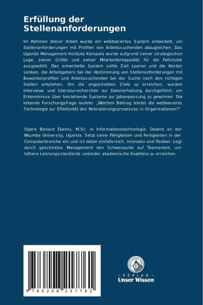 Im Rahmen dieser Arbeit wurde ein webbasiertes System entwickelt, um Stellenanforderungen mit Profilen von Arbeitssuchenden abzugleichen. Das Uganda Management Institute Kampala wurde aufgrund seiner strategischen Lage, seiner Größe und seiner Mitarbeiterkapazität für die Fallstudie ausgewählt. Das entwickelte System sollte Zeit sparen und die Kosten senken, die Arbeitgebern bei der Abstimmung von Stellenanforderungen mit Bewerberprofilen und Arbeitssuchenden bei der Suche nach den richtigen Stellen entstehen. Um die angestrebten Ziele zu erreichen, wurden Interviews und Literaturrecherchen zur Datenerhebung durchgeführt, um Erkenntnisse über bestehende Systeme zur Jobanpassung zu gewinnen. Die leitende Forschungsfrage lautete: "Welchen Beitrag leistet die webbasierte Technologie zur Effektivität des Rekrutierungsprozesses in Organisationen?"