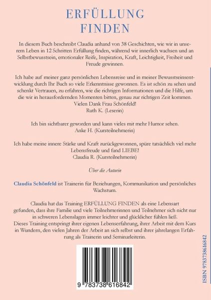 Claudia Schönfeld ist seit 1991 mit Dirk Schönfeld verheiratet, Mutter von zwei Töchtern und seit 2010 Trainerin für Beziehungen, Kommunikation und persönliches Wachstum. Claudia hat das Training ERFÜLLUNG FINDEN als eine Lebensart gefunden, das ihre Familie und viele Teilnehmerinnen und Teilnehmer sich nicht nur in schweren Lebenslagen immer leichter und glücklicher fühlen ließ. Dieses Training entspringt ihrer eigenen Lebenserfahrung, ihrer Arbeit mit dem Kurs in Wundern, den vielen Jahren der Arbeit an sich selbst und ihrer jahrelangen Erfahrung als Trainerin und Seminarleiterin.