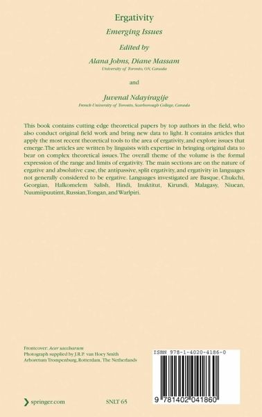 This volume presents a collection of papers on the enticing and complex theme of Ergativity. The papers exemplify theoretical depth applied to a wide range of languages, with the majority of papers based on original fieldwork. Ergativity refers to a grammatical pattern in which the logical subject of intransitive clauses and the logical object of transitive clauses share some grammatical features, and in this respect differ from transitive subjects. The shared features are often case and/or agreement, but a variety of other relevant features have also been isolated in the literature. The ergative pattern contrasts with that found in accusative languages where the subject has the same grammatical marking in intransitive and transitive clauses, while the object has different marking. Ergativity provides us with an ideal testing ground for claims about the range and limits of language variation, and about the degree of elasticity in the morphology-syntax interface. However, because an understanding of ergativity rests on an understanding of other difficult grammatical issues such as grammatical relations, transitivity, aspect, person, case, and agreement, a clear and integrated analysis of the phenomenon has remained elusive. Since Dixon's (1967/1972) pioneer study of Dyirbal, extensive research has been conducted on a variety of ergative languages over the world from both descriptive, typological, and theoretical perspectives (see inter alia Anderson 1976, Silverstein 1976, Comrie 1978, Dixon 1979, 1994, DeLancey 1981, Marantz 1984, Levin & Massam 1985, Johns 1992, Bittner and Hale 1996, to name a few).