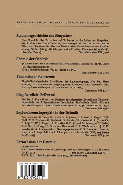 The Pollen and Pollen Tube.- Vergleichende Biochemie der Phenylpropane.- Photomorphogenetische Reaktionssysteme in Pflanzen 2. Teil: Der Einfluß kurzweUigen Lichts auf Wachstum und Entwicklung.- Homing Orientation in Migrating Fishes.- Beziehungen zwischen Entomophagen und ihrer Beute als Grundlage der biologischen Schädlingskontrolle.- Die Biologie der kondensierten anorganischen Phosphate.- Über die Rolle der Frequenzgruppe beim Hören.- Namenverzeichnis.