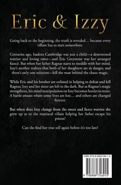 Going back to the beginning, the truth is revealed... because every villain has to start somewhere. Centuries ago, Isadora Cambridge was just a child-a determined warrior and loving sister-and Eric Greystone was her arranged fiancé. But when her father Ragnar starts to meddle with her mind, Izzy's mother realizes that both of her daughters are in danger, and there's only one solution-kill the man behind the chaos magic. While Eric and his brother are enlisted in helping to defeat and kill Ragnar, Izzy and her sister are left in the dark. But as Ragnar's magic strengthens, his mind manipulation on Izzy becomes harder to resist. A battle ensues where some lives are lost... and others are changed forever. But when does Izzy change from the sweet and fierce warrior she grew up as to the maniacal villain helping her father escape his prison? Can she find her true self again before it's too late?