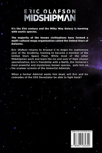 It's the 51st century and the Milky Way Galaxy is teeming with exotic species. The majority of the known civilizations have formed a multi-cultural mega organization called the United Stars of Galaxies. Eric Olafson returns to Arsenal II to begin his sophomore year at the Academy, training to become a member of the United Stars Space Fleet. While most of the other Midshipmen work and learn the ins and outs of their chosen specialization, Eric’s friendship with a Narth, the Universe’s most powerful and mysterious known species, puts him on the scanner screens of the Immortal Admirals. When a former Admiral wants him dead, will Eric and his comrades of the USS Devastator be able to fight back?