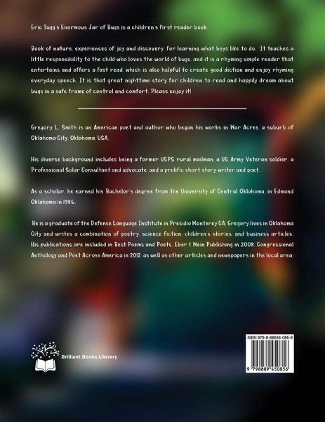 Eric Tugg's Enormous Jar of Bugs is a children's first reader book. Book of nature, experiences of joy and discovery, for learning what boys like to do. It teaches a little responsibility to the child who loves the world of bugs, and it is a rhyming simple reader that entertains and offers a fast read, which is also helpful to create good diction and enjoy rhyming everyday speech. It is that great nighttime story for children to read and happily dream about bugs in a safe frame of control and comfort. Please enjoy it!