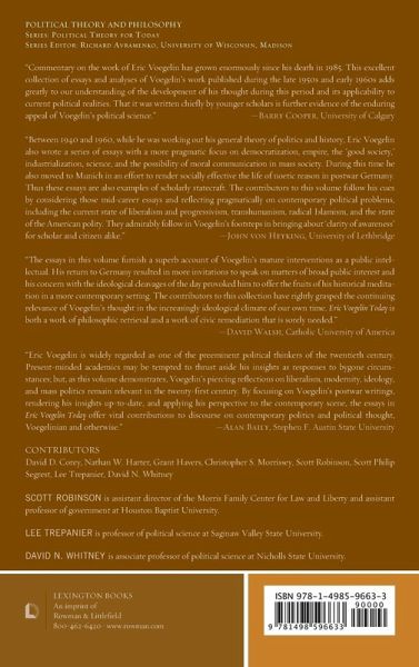 Chapter 1: Rethinking Eric Voegelin's Interpretation of Liberalism and Its History David D. Corey Chapter 2: The Necessity of Moral Communication in a Pluralistic Political Environment Scott Robinson Chapter 3: Defenders of Democracy: Freedom and Responsibility in America Today Scott Robinson Chapter 4: The Origins of Scientism: Revisited David N. Whitney Chapter 5: Voegelin, Rawls, and the Persistence of Liberal Civil Theology Grant Havers Chapter 6: The Comparative Politics of Eric Voegelin Lee Trepanier Chapter 7: The Dream of the Caliphate and the Loss of Reality: An Application of Eric Voegelin's "The Origins of Totalitarianism" and "In Search of the Ground" Scott Philip Segrest Chapter 8: "The Five Ways of World-Empire" Christopher S. Morrissey Chapter 9: Eric Voegelin's 1944 "Political Theory and the Pattern of General History": An Account from the Biography of a Philosophizing Consciousness Nathan Harter