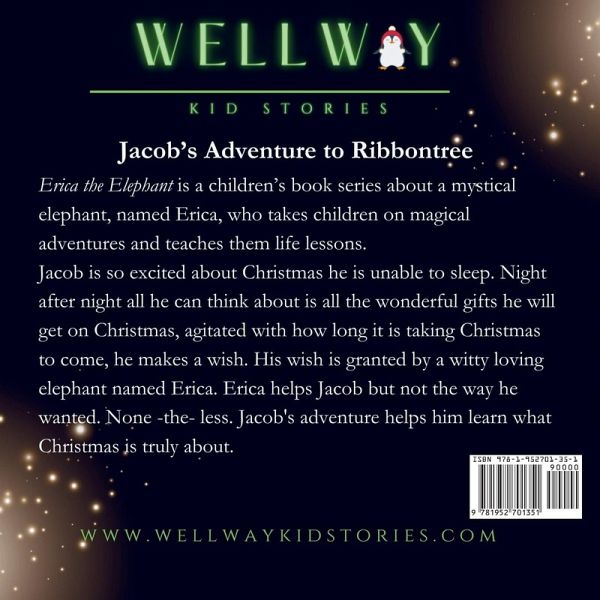 Erica the Elephant is a children's book series about a mystical elephant, named Erica, who takes children on magical adventures and teaches them life lessons. Jacob is so excited about Christmas he is unable to sleep. Night after night all he can think about is all the wonderful gifts he will get on Christmas, agitated with how long it is taking Christmas to come, he makes a wish. His wish is granted by a witty loving elephant named Erica. Erica helps Jacob but not the way he wanted. None -the- less. Jacob's adventure helps him learn what Christmas is truly about.