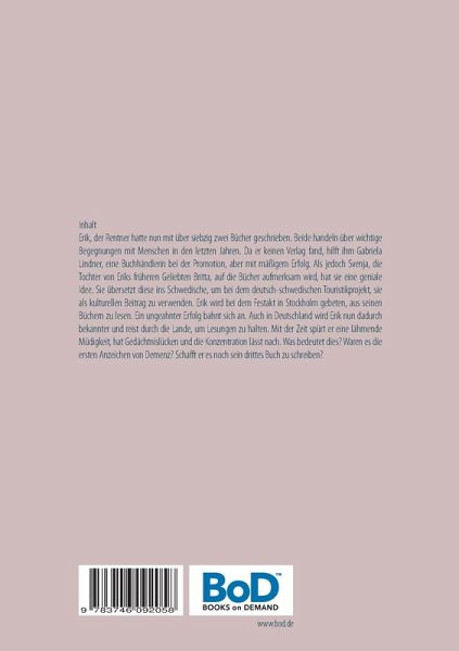 Erik, der Rentner, hatte nun mit über siebzig zwei Bücher geschrieben. Beide handeln über wichtige Begegnungen mit Menschen in den letzten Jahren. Da er keinen Verlag fand, hilft ihm Gabriela Lindner, eine Buchhändlerin bei der Promotion, aber mit mäßigem Erfolg. Als jedoch Svenja, die Tochter von Eriks früherer Geliebten Britta auf die Bücher aufmerksam wird, hat sie eine geniale Idee. Sie übersetzt diese ins Schwedische, um bei dem deutsch-schwedischen Touristikprojekt sie als kulturellen Beitrag zu verwenden. Erik wird bei dem Festakt in Stockholm gebeten, aus seinen Büchern zu lesen. Ein ungeahnter Erfolg bahnt sich an. Auch in Deutschland wird Erik nun dadurch bekannter und reist durch die Lande, um Lesungen zu halten. Mit der Zeit spürt er eine lähmende Müdigkeit, hat Gedächtnislücken und die Konzentration lässt nach. Was bedeutet dies? Waren es die ersten Anzeichen von Demenz? Schafft er es noch, sein drittes Buch zu schreiben?