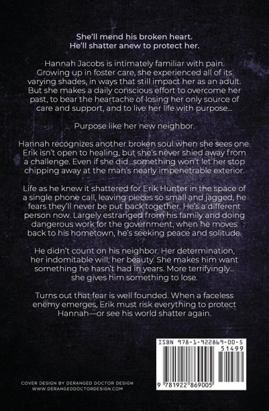 She'll mend his broken heart. He'll shatter anew to protect her. Hannah Jacobs is intimately familiar with pain. Growing up in foster care, she experienced all of its varying shades, in ways that still impact her as an adult. But she makes a daily conscious effort to overcome her past, to bear the heartache of losing her only source of care and support, and to live her life with purpose... Purpose like her new neighbor. Hannah recognizes another broken soul when she sees one. Erik isn't open to healing, but she's never shied away from a challenge. Even if she did...something won't let her stop chipping away at the man's nearly impenetrable exterior. Life as he knew it shattered for Erik Hunter in the space of a single phone call, leaving pieces so small and jagged, he fears they'll never be put back together. He's a different person now. Largely estranged from his family and doing dangerous work for the government, when he moves back to his hometown, he's seeking peace and solitude. He didn't count on his neighbor. Her determination, her indomitable will, her beauty. She makes him want something he hasn't had in years. More terrifyingly...she gives him something to lose. Turns out that fear is well founded. When a faceless enemy emerges, Erik must risk everything to protect Hannah-or see his world shatter again. This is the beginning of Erik and Hannah's story, book one in a three-part serial. That means happy-for-now endings until book three, when Erik and Hannah will get the happy ever after they deserve.