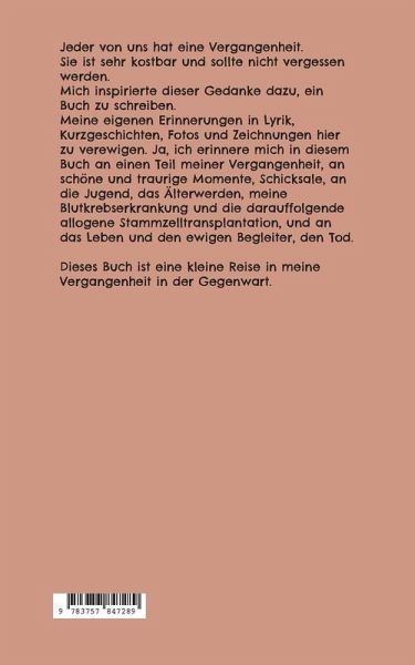 Jeder von uns hat eine Vergangenheit.Sie ist sehr kostbar und sollte nicht vergessen werden.Mich inspirierte dieser Gedanke dazu, ein Buch zu schreiben. Meine eigenen Erinnerungen in Lyrik, Kurzgeschichten, Fotos und Zeichnungen hier zu verewigen. Ja, ich erinnere mich in diesem Buch an einen Teil meiner Vergangenheit, an schöne und traurige Momente, Schicksale, an die Jugend, das Älterwerden, meine Blutkrebserkrankung und die darauffolgende allogene Stammzelltransplantation, und an das Leben und den ewigen Begleiter, den Tod.Dieses Buch ist eine kleine Reise in meine Vergangenheit in der Gegenwart.