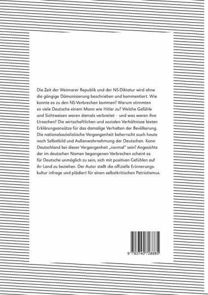 Die Zeit der Weimarer Republik und der NS-Diktatur wird ohne die gängige Dämonisierung beschrieben und kommentiert. Wie konnte es zu den NS-Verbrechen kommen? Warum stimmten so viele Deutsche einem Mann wie Hitler zu? Welche Gefühle und Sichtweisen waren damals verbreitet und was waren ihre Ursachen? Die wirtschaftlichen und sozialen Verhältnisse bieten Erklärungsansätze für das damalige Verhalten der Bevölkerung. Die nationalsozialistische Vergangenheit beherrscht auch heute noch Selbstbild und Außenwahrnehmung der Deutschen. Kann Deutschland bei dieser Vergangenheit normal sein? Angesichts der im deutschen Namen begangenen Verbrechen scheint es für Deutsche unmöglich zu sein, sich mit positiven Gefühlen auf ihr Land zu beziehen. Der Autor stellt die offizielle Erinnerungskultur infrage und plädiert für einen selbstkritischen Patriotismus.Das Buch wendet sich an politisch und historisch Interessierte.