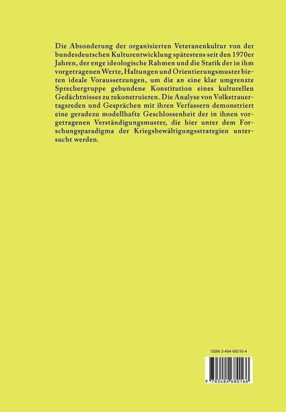 Die Absonderung der organisierten Veteranenkultur von der bundesdeutschen Kulturentwicklung spätestens seit den 1970er Jahren, der enge ideologische Rahmen und die Statik der in ihm vorgetragenen Werte, Haltungen und Orientierungsmuster bieten ideale Voraussetzungen, um die an eine klar umgrenzte Sprechergruppe gebundene Konstitution eines kulturellen Gedächtnisses zu rekonstruieren. Die Analyse von Volkstrauertagsreden und Gesprächen mit ihren Verfassern demonstrieren eine geradezu modellhafte Geschlossenheit der in ihnen vorgetragenen Verständigungsmuster. Die Traditionen der klassisch-epideiktischen Redegattung der Funeralrede und ihre methodische Erschließung durch die rhetorische Topik-Theorie ermöglichen Einblicke in den Leittopos der Kameradschaft, der mit den an ihn assoziierten Memorialtopoi ein kommunikatives in ein kulturelles Gedächtnis zu überführen versucht. Diese Erinnerungsmuster sind nicht notwendigerweise an die Erfahrung gebunden. Als Orte eines artifiziellen, d.h. rhetorisch durchformten Gedächtnisses dienen sie weniger einer konkreten historisch-faktischen Rekonstruktion, als vielmehr der Bewältigung biographischer Schlüsselerlebnisse. So abseitig die fokussierten Quellen (die sich in wesentlichen Punkten von jenen Kriegserinnerungen unterscheiden, die in den literarischen Kanon aufgenommen wurden) auf den ersten Blick wirken mögen, so ergiebig gestaltet sich ihre Untersuchung unter dem Forschungsparadigma der Kriegsbewältigungsstrategien.
