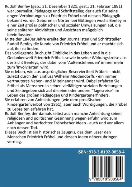 Das vorliegende Buch gibt Einblicke in das Leben und in die Gedankenwelt Friedrich Fröbels sowie in seine Wirkungskreise. Mitte der 1840er Jahre ereilte den Journalisten und Schriftsteller Rudolf Benfey die Kunde von Friedrich Fröbel und er machte sich auf, ihn zu finden. Sie erleben in diesem Buch, wie Benfey vom 'Außenstehenden' immer mehr zum 'Involvierten' wird, wie aus ursprünglicher Reserviertheit Fröbels ein immer vertrauteres Neben- und Miteinander wird. Dabei erfahren Sie Fröbel als Menschen in seinem Wirkungskreis, in seinen vielfältigen sozialen Beziehungen und Sie begeben sich auf die eine oder andere "Tagesreise" im Leben des großen Pädagogen und Kindergartenerfinders. Sie erfahren von den Anfechtungen (wie dem preußischen Kindergartenverbot von 1851), aber auch den Würdigungen und Freuden, die Fröbel zu Lebzeiten erfahren hat. Rudolf Benfey, der selbst auch manche Anfechtung seiner religiösen und politischen Gesinnung wegen erfuhr, wird zum Anhänger und Verfechter Fröbelscher Ideen - auch und vor allem nach dessen Tod. Dieses Buch ist ein historisches Zeugnis, das dem Leser den Menschen Friedrich Fröbel und auch seine Ideen näherzubringen vermag.