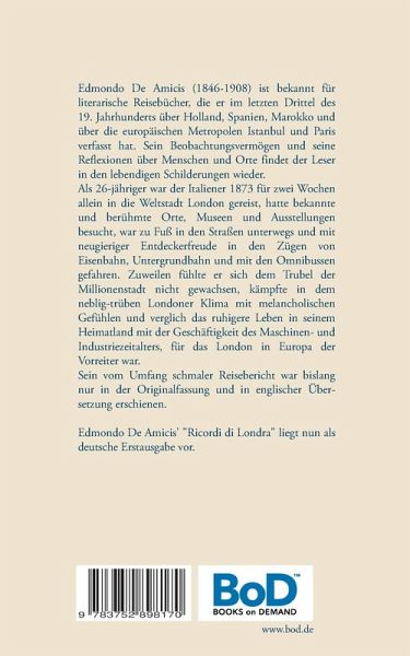 Edmondo De Amicis (1846-1908) ist bekannt für literarische Reisebücher, die er im letzten Drittel des 19. Jahrhunderts über Holland, Spanien, Marokko und über die europäischen Metropolen Istanbul und Paris verfasst hat. Sein Beobachtungsvermögen und seine Reflexionen über Menschen und Orte findet der Leser in den lebendigen Schilderungen wieder. Als 26-jähriger war der Italiener 1873 für zwei Wochen allein in die Weltstadt London gereist, hatte bekannte und berühmte Orte, Museen und Ausstellungen besucht, war zu Fuß in den Straßen unterwegs und mit neugieriger Entdeckerfreude in den Zügen von Eisenbahn, Untergrundbahn und mit den Omnibussen gefahren. Zuweilen fühlte er sich dem Trubel der Millionenstadt nicht gewachsen, kämpfte in dem neblig-trüben Londoner Klima mit melancholischen Gefühlen und verglich das ruhigere Leben in seinem Heimatland mit der Geschäftigkeit des Maschinen- und Industriezeitalters, für das London in Europa der Vorreiter war. Sein vom Umfang schmaler Reisebericht war bislang nur in der Originalfassung und in englischer Übersetzung erschienen. Edmondo De Amicis' "Ricordi di Londra" liegt nun als deutsche Erstausgabe vor.