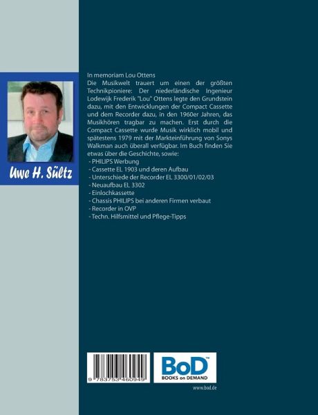 In memoriam Lou OttensDie Musikwelt trauert um einen der größten Technikpioniere:Der niederländische Ingenieur Lodewijk Frederik "Lou" Ottens legte den Grundstein dazu, mit den Entwicklungen der Compact Cassette und dem Recorder dazu, in den 1960er Jahren, das Musikhören tragbar zu machen. Erst durch die Compact Cassette wurde Musik wirklich mobil und spätestens 1979 mit der Markteinführung von Sonys Walkman auch überall verfügbar. Im Buch finden Sie etwas über die Geschichte, sowie: - PHILIPS Werbung- Cassette EL 1903 und deren Aufbau- Unterschiede der Recorder EL 3300/01/02/03- Neuaufbau EL 3302- Einlochkassette- Chassis PHILIPS bei anderen Firmen verbaut- Recorder in OVP- Techn. Hilfsmittel und Pflege-Tipps