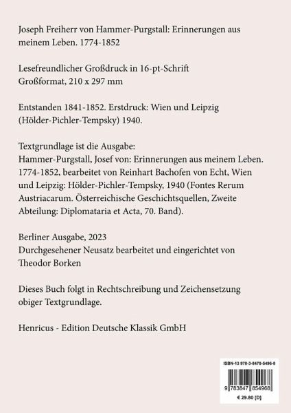 Joseph Freiherr von Hammer-Purgstall: Erinnerungen aus meinem Leben. 1774-1852Lesefreundlicher Großdruck in 16-pt-SchriftGroßformat, 210 x 297 mmBerliner Ausgabe, 2023Durchgesehener Neusatz bearbeitet und eingerichtet von Theodor BorkenEntstanden 1841-1852. Erstdruck: Wien und Leipzig (Hölder-Pichler-Tempsky) 1940.Textgrundlage ist die Ausgabe:Hammer-Purgstall, Josef von: Erinnerungen aus meinem Leben. 1774-1852, bearbeitet von Reinhart Bachofen von Echt, Wien und Leipzig: Hölder-Pichler-Tempsky, 1940 (Fontes Rerum Austriacarum. Österreichische Geschichtsquellen, Zweite Abteilung: Diplomataria et Acta, 70. Band).Dieses Buch folgt in Rechtschreibung und Zeichensetzung obiger Textgrundlage.Gesetzt aus der Minion Pro, 16 pt.Henricus - Edition Deutsche Klassik GmbH