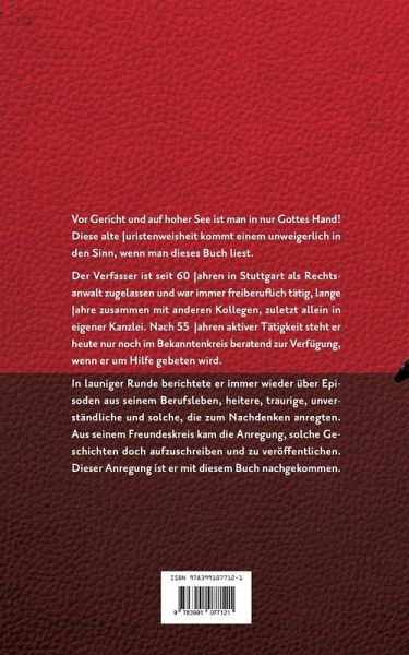 Vor Gericht und auf hoher See ist man in nur Gottes Hand! Diese alte Juristenweisheit kommt einem unweigerlich in den Sinn, wenn man dieses Buch liest.Der Verfasser ist seit 60 Jahren in Stuttgart als Rechtsanwalt zugelassen und war immer freiberuflich tätig, lange Jahre zusammen mit anderen Kollegen, zuletzt allein in eigener Kanzlei. Nach 55 Jahren aktiver Tätigkeit steht er heute nur noch im Bekanntenkreis beratend zur Verfügung, wenn er um Hilfe gebeten wird.In launiger Runde berichtete er immer wieder über Episoden aus seinem Berufsleben, heitere, traurige, unverständliche und solche, die zum Nachdenken anregten. Aus seinem Freundeskreis kam die Anregung, solche Geschichten doch aufzuschreiben und zu veröffentlichen. Dieser Anregung ist er mit diesem Buch nachgekommen.