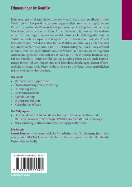 Erinnerungen sind individuell, kollektiv und Ausdruck gesellschaftlicher Verhältnisse. Ausgewählte Erinnerungen sollen an staatlich geförderten Orten u. a. nationale Zugehörigkeit produzieren. Als Repräsentationen von Macht sind sie zudem umstritten. Annett Schulze zeigt, wie an vier bedeutsamen Erinnerungsorten ein national-kulturelles Funktionsgedächtnis im Südafrika nach der Apartheid hergestellt wird. Nach dem Ende des Apartheidstaates und mit den ersten freien Wahlen im Jahr 1994 änderten sich die Machtverhältnisse und damit die Erinnerungspolitiken. Was offiziell erinnert wird, ist konflikthaft; welches Wissen auf den musealen Agenden Anerkennung findet und welches Wissen nur in bestimmten Räumen sagbar ist, ebenfalls. Denn sowohl Nation-Building-Prozesse als auch Erinnerungsräume sind von Hegemonie und Dissidenz durchzogen, denen Widersprüche inhärent sind. Diese Widersprüche, so die Hauptthese, ermöglichen jedoch erst ein Widersprechen.