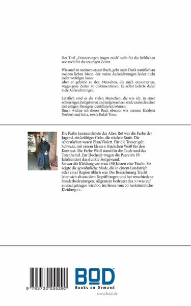 Der Titel "Erinnerungen tragen mich" steht für die fröhlichen wie auch für die traurigen Zeiten.Wie auch in meinem ersten Buch, geht mein Dank natürlich an meinen lieben Mann, der meine Aufzeichnungen leider nicht mehr verfolgen kann. Aber er gehörte zu den Menschen, die mich ermunterten, vergangene Zeiten zu dokumentieren. Er selbst lieferte dafür viele Aufzeichnungen.Letztlich sind es die vielen Menschen, die wie ich in einer schwierigen Zeit geboren und aufgewachsen sind und sich sicher mit einigen Passagen identifizieren können.Ihnen widme ich dieses Buch ebenso, wie meinen Kindern Norbert und Jutta, sowie Enkel Timo.