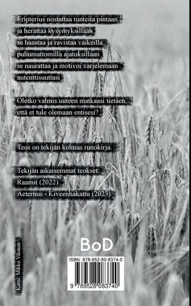 Eripterius nostattaa tunteita pintaan ja herättää kysymyksillään. Se haastaa ja ravistaa vaikeilla puhumattomilla ajatuksillaan. Se naurattaa ja motivoi varjelemaan autenttisuuttasi. Oletko valmis uuteen matkaasi tietäen, että et tule olemaan entisesi? Teos on tekijän kolmas runokirja. Tekijän aikaisemmat teokset: Raamit (2022) Aeternus - Kiveenhakattu (2023)
