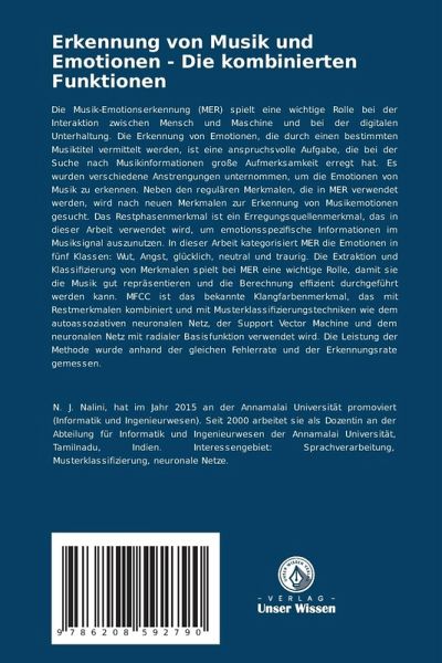 Die Musik-Emotionserkennung (MER) spielt eine wichtige Rolle bei der Interaktion zwischen Mensch und Maschine und bei der digitalen Unterhaltung. Die Erkennung von Emotionen, die durch einen bestimmten Musiktitel vermittelt werden, ist eine anspruchsvolle Aufgabe, die bei der Suche nach Musikinformationen große Aufmerksamkeit erregt hat. Es wurden verschiedene Anstrengungen unternommen, um die Emotionen von Musik zu erkennen. Neben den regulären Merkmalen, die in MER verwendet werden, wird nach neuen Merkmalen zur Erkennung von Musikemotionen gesucht. Das Restphasenmerkmal ist ein Erregungsquellenmerkmal, das in dieser Arbeit verwendet wird, um emotionsspezifische Informationen im Musiksignal auszunutzen. In dieser Arbeit kategorisiert MER die Emotionen in fünf Klassen: Wut, Angst, glücklich, neutral und traurig. Die Extraktion und Klassifizierung von Merkmalen spielt bei MER eine wichtige Rolle, damit sie die Musik gut repräsentieren und die Berechnung effizient durchgeführt werden kann. MFCC ist das bekannte Klangfarbenmerkmal, das mit Restmerkmalen kombiniert und mit Musterklassifizierungstechniken wie dem autoassoziativen neuronalen Netz, der Support Vector Machine und dem neuronalen Netz mit radialer Basisfunktion verwendet wird. Die Leistung der Methode wurde anhand der gleichen Fehlerrate und der Erkennungsrate gemessen.