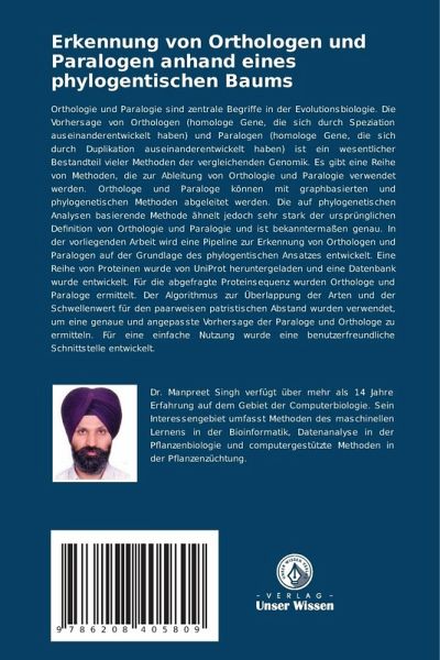 Orthologie und Paralogie sind zentrale Begriffe in der Evolutionsbiologie. Die Vorhersage von Orthologen (homologe Gene, die sich durch Speziation auseinanderentwickelt haben) und Paralogen (homologe Gene, die sich durch Duplikation auseinanderentwickelt haben) ist ein wesentlicher Bestandteil vieler Methoden der vergleichenden Genomik. Es gibt eine Reihe von Methoden, die zur Ableitung von Orthologie und Paralogie verwendet werden. Orthologe und Paraloge können mit graphbasierten und phylogenetischen Methoden abgeleitet werden. Die auf phylogenetischen Analysen basierende Methode ähnelt jedoch sehr stark der ursprünglichen Definition von Orthologie und Paralogie und ist bekanntermaßen genau. In der vorliegenden Arbeit wird eine Pipeline zur Erkennung von Orthologen und Paralogen auf der Grundlage des phylogentischen Ansatzes entwickelt. Eine Reihe von Proteinen wurde von UniProt heruntergeladen und eine Datenbank wurde entwickelt. Für die abgefragte Proteinsequenz wurden Orthologe und Paraloge ermittelt. Der Algorithmus zur Überlappung der Arten und der Schwellenwert für den paarweisen patristischen Abstand wurden verwendet, um eine genaue und angepasste Vorhersage der Paraloge und Orthologe zu ermitteln. Für eine einfache Nutzung wurde eine benutzerfreundliche Schnittstelle entwickelt.