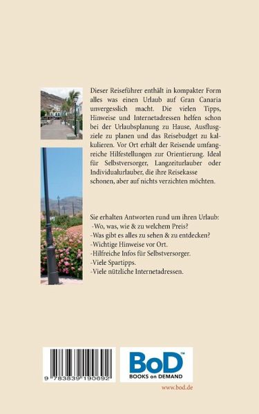 Dieser Reiseführer enthält in kompakter Form alles, was einen Urlaub auf Gran Canaria unvergesslich macht. Die vielen Tipps, Hinweise und Internetadressen helfen schon bei der Urlaubsplanung zu Hause, Ausflugsziele zu planen und das Reisebudget zu kalkulieren. Vor Ort erhält der Reisende umfangreiche Hilfestellungen zur Orientierung. Ideal für Selbstversorger, Langzeiturlauber oder Individualurlauber, die ihre Reisekasse schonen bzw. keine überteuerten Preise zahlen möchten. Entdecken Sie die Inselhighlights oder gehen Sie abseits der Touristenpfade auf Entdeckungstour. Umfangreiche Infos zu sportlichen Aktivitäten wie Golf, Surfen etc. Einfache Ortskarten sind enthalten. Ideal für alle, die an wirklich praktischen Informationen interessiert sind.