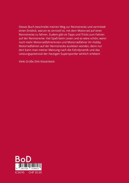 Dieses Buch beschreibt meinen Weg zur Rennstrecke und vermittelt einen Einblick, warum es sinnvoll ist, mit dem Motorrad auf einer Rennstrecke zu fahren. Zudem gibt es Tipps und Tricks zum Fahren auf der Rennstrecke. Viel Spaß beim Lesen und es wäre schön, wenn noch mehr Motorradfahrerinnen und Motorradfahrer ihr Hobby Motorradfahren auf der Rennstrecke ausleben würden, denn nur dort kann man meiner Meinung nach die Fahrdynamik und das Leistungspotenzial der heutigen Supersportler wirklich erleben!Viele Grüße,Dirk Kissenbeck