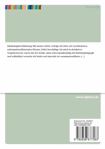 Mit meiner Arbeit verfolge ich Ziele auf verschiedenen, aufeinanderaufbauenden Ebenen. Dabei beschäftige ich mich in deduktiver Vorgehensweise zuerst mit der Schule, dann schwerpunktmäßig mit Erlebnispädagogik und schließlich versuche ich beides auf sinnvolle Art zusammenzuführen. Meine Idee ist zu erarbeiten, inwieweit handlungsorientierte und insbesondere erlebnispädagogische Elemente in den Unterricht der Schule zur individuellen Lernförderung integriert werden können. Der Begriff Erlebnispädagogik stellt für mich dabei einen Oberbegriff für alle praktisch ausgerichteten Erziehungsbemühungen und -formen dar, die positive Erziehungswirkungen von intensiven, unmittelbaren Erfahrungen und Erlebnissen erwarten. Die verschiedenen Unternehmungen sollen derart sein, dass man erstens kein ausgebildeter Erlebnispädagoge sein muss, um sie durchführen zu können und zweitens es möglich ist, sie im Regelunterricht mehr oder weniger fest zu installieren.