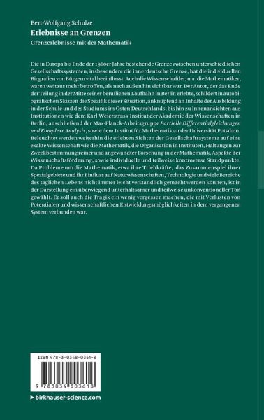 Die in Europa bis Ende der 1980er Jahre bestehende Grenze zwischen unterschiedlichen Gesellschaftssystemen, insbesondere die innerdeutsche Grenze, hat die individuellen Biografien von Bürgern vital beeinflusst. Auch die Wissenschaftler, u.a. die Mathematiker, waren weitaus mehr betroffen, als nach außen hin sichtbar war. Der Autor, der das Ende der Teilung in der Mitte seiner beruflichen Laufbahn in Berlin erlebte, schildert in autobiografischen Skizzen die Spezifik dieser Situation, anknüpfend an Inhalte der Ausbildung in der Schule und des Studiums im Osten Deutschlands, bis hin zu Innenansichten aus Institutionen wie dem Karl-Weierstrass-Institut der Akademie der Wissenschaften in Berlin, anschließend der Max-Planck-Arbeitsgruppe Partielle Differentialgleichungen und Komplexe Analysis, sowie dem Institut für Mathematik an der Universität Potsdam. Beleuchtet werden weiterhin die erlebten Sichten der Gesellschaftssysteme auf eine exakte Wissenschaft wie die Mathematik, die Organisation in Instituten, Haltungen zur Zweckbestimmung reiner und angewandter Forschung in der Mathematik, Aspekte der Wissenschaftsförderung, sowie individuelle und teilweise kontroverse Standpunkte. Da Probleme um die Mathematik, etwa ihre Triebkräfte, das Zusammenspiel ihrer Spezialgebiete und ihr Einfluss auf Naturwissenschaften, Technologie und viele Bereiche des täglichen Lebens nicht immer leicht verständlich gemacht werden können, ist in der Darstellung ein überwiegend unterhaltsamer und teilweise unkonventioneller Ton gewählt. Er soll auch die Tragik ein wenig vergessen machen, die mit Verlusten von Potentialen und wissenschaftlichen Entwicklungsmöglichkeiten in dem vergangenen System verbunden war.