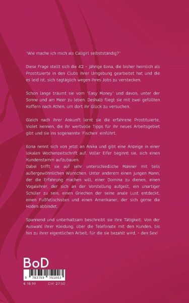 "Wie mache ich mich als Callgirl selbstständig?" Diese Frage beschäftigt Anika, alias Ilona, die ihren Lebensunterhalt u.a. als Prostituierte verdient.Von mehr Selbstbestimmung und Freiheit träumemd, fliegt sie mit zwei gefüllten Koffern nach Athen, um sich dort im Escort Bereich selbstständig zu machen. - Gleich nach ihrer Ankunft lernt sie das erfahrene Callgirl, Violet kennen, die ihr wertvolle Tipps für ihr neues Arbeitsgebiet gibt und sie ins sogenannte 'Fischen' einführt.Anika gibt eine Annonce in einer lokalen Wochenzeitschrift auf und voller Eifer beginnt sie, sich einen Kundenstamm aufzubauen. Dabei trifft sie auf sehr unterschiedliche Männer mit teils außergewöhnlichen Wünschen!Spannend und unterhaltsam beschreibt sie ihre Tätigkeit: Von der Auswahl ihrer Kleidung, über die Telefonate mit den Kunden, bis hin zu ihrer eigentlichen Arbeit, für die sie bezahlt wird, - den Sex!