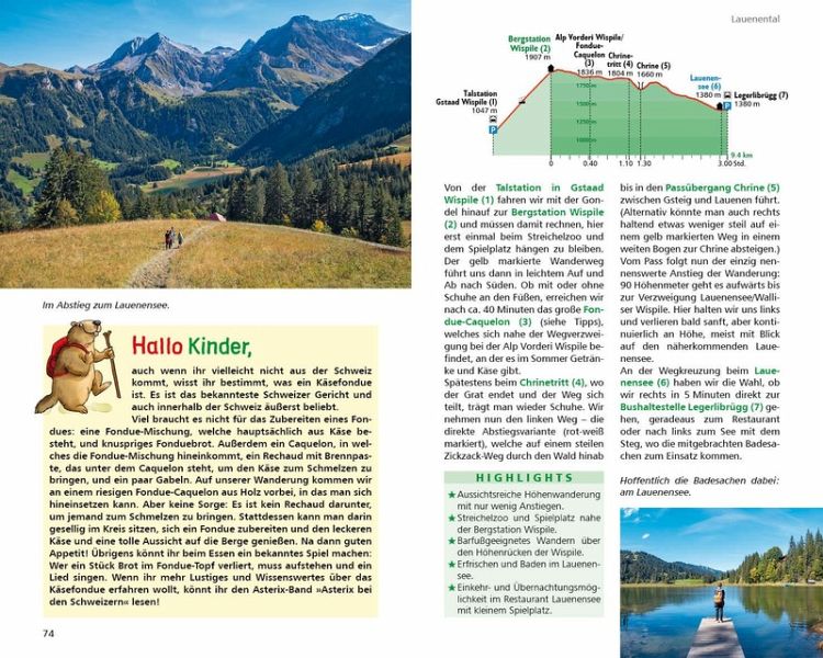 Jede Tour ist sorgfältig beschrieben und enthält Altersempfehlungen, Schwierigkeitsgrade sowie Gehzeiten. Zudem gibt es Informationen zur Anreise mit öffentlichen Verkehrsmitteln, Übernachtungsmöglichkeiten und zahlreichen Varianten. Detaillierte Wegbeschreibungen, aussagekräftige Höhenprofile und Karten mit Routeneinträgen machen das Wandern zum Kinderspiel. Geprüfte GPS-Tracks zum Download erleichtern die Navigation.