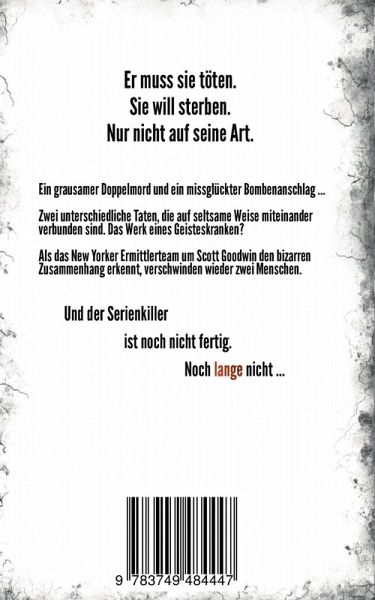 Er muss sie töten.Sie will sterben.Nur nicht auf seine Art.Lucy Robinson ist fest entschlossen, sich das Leben zu nehmen, als sie plötzlich entführt wird.Ein Jahr später beginnt eine seltsame Mordserie, die die Verhaltensanalyseeinheit des FBI vor eine ihrer schwersten Aufgaben stellt: einen Täter zu ermitteln, der keine verwertbaren Spuren hinterlässt.Das Werk eines Geisteskranken?Als das New Yorker Ermittlerteam um Scott Goodwin den bizarren Zusammenhang erkennt, verschwinden wieder zwei Menschen.Und der Serienkiller ist noch nicht fertig. Noch lange nicht ...Nach dem Erfolg von…mehr