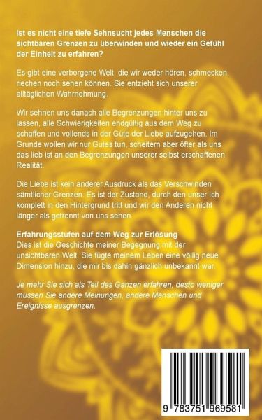Ist es nicht eine tiefe Sehnsucht jedes Menschen die sichtbaren Grenzen zu überwinden und wieder ein Gefühl der Einheit zu erfahren?Es gibt eine verborgene Welt, die wir weder hören, schmecken, riechen noch sehen können. Sie entzieht sich unserer alltäglichen Wahrnehmung.Wir sehnen uns danach alle Begrenzungen hinter uns zu lassen, alle Schwierigkeiten endgültig aus dem Weg zu schaffen und vollends in der Güte der Liebe aufzugehen. Im Grunde wollen wir nur Gutes tun, scheitern aber öfter als uns das lieb ist an den Begrenzungen unserer selbst erschaffenen Realität.Was Sie in diesem Buch lernen:- Was bedeutet Erlösung?- Erlösung durch den Sex?- Wer bin ich ohne Arbeit und ohne Familie?- Verantwortung - was genau bedeutet das?- Was unsere fünf Sinne nicht erfassen können- Die Liebe - der Urstoff unserer Existenz- Erfahrungsstufen auf dem Weg zur ErlösungDie Liebe ist kein anderer Ausdruck als das Verschwinden sämtlicher Grenzen. Es ist der Zustand, durch den unser Ich komplett in den Hintergrund tritt und wir den Anderen nicht länger als getrennt von uns sehen.Erfahrungsstufen auf dem Weg zur ErlösungDies ist die Geschichte meiner Begegnung mit der unsichtbaren Welt. Sie fügte meinem Leben eine völlig neue Dimension hinzu, die mir bis dahin gänzlich unbekannt war.Lernen Sie diesen größeren Zusammenhang der Dinge im Leben zu verstehen und auch zu erfahren. Sie werden gelassener, friedvoller, lebendiger, und die Liebe wird Ihr stetiger Begleiter.Je mehr Sie sich als Teil des Ganzen erfahren, desto weniger müssen Sie andere Meinungen, andere Menschen und Ereignisse ausgrenzen.