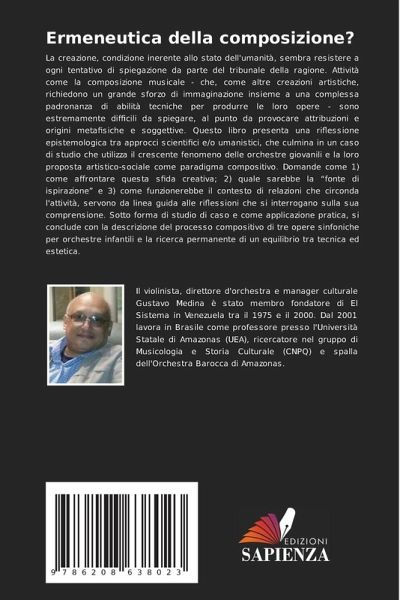 La creazione, condizione inerente allo stato dell'umanità, sembra resistere a ogni tentativo di spiegazione da parte del tribunale della ragione. Attività come la composizione musicale - che, come altre creazioni artistiche, richiedono un grande sforzo di immaginazione insieme a una complessa padronanza di abilità tecniche per produrre le loro opere - sono estremamente difficili da spiegare, al punto da provocare attribuzioni e origini metafisiche e soggettive. Questo libro presenta una riflessione epistemologica tra approcci scientifici e/o umanistici, che culmina in un caso di studio che utilizza il crescente fenomeno delle orchestre giovanili e la loro proposta artistico-sociale come paradigma compositivo. Domande come 1) come affrontare questa sfida creativa; 2) quale sarebbe la "fonte di ispirazione" e 3) come funzionerebbe il contesto di relazioni che circonda l'attività, servono da linea guida alle riflessioni che si interrogano sulla sua comprensione. Sotto forma di studio di caso e come applicazione pratica, si conclude con la descrizione del processo compositivo di tre opere sinfoniche per orchestre infantili e la ricerca permanente di un equilibrio tra tecnica ed estetica.