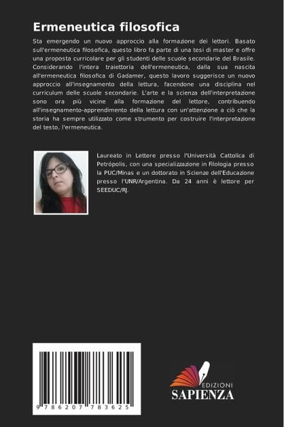 Sta emergendo un nuovo approccio alla formazione dei lettori. Basato sull'ermeneutica filosofica, questo libro fa parte di una tesi di master e offre una proposta curricolare per gli studenti delle scuole secondarie del Brasile. Considerando l'intera traiettoria dell'ermeneutica, dalla sua nascita all'ermeneutica filosofica di Gadamer, questo lavoro suggerisce un nuovo approccio all'insegnamento della lettura, facendone una disciplina nel curriculum delle scuole secondarie. L'arte e la scienza dell'interpretazione sono ora più vicine alla formazione del lettore, contribuendo all'insegnamento-apprendimento della lettura con un'attenzione a ciò che la storia ha sempre utilizzato come strumento per costruire l'interpretazione del testo, l'ermeneutica.