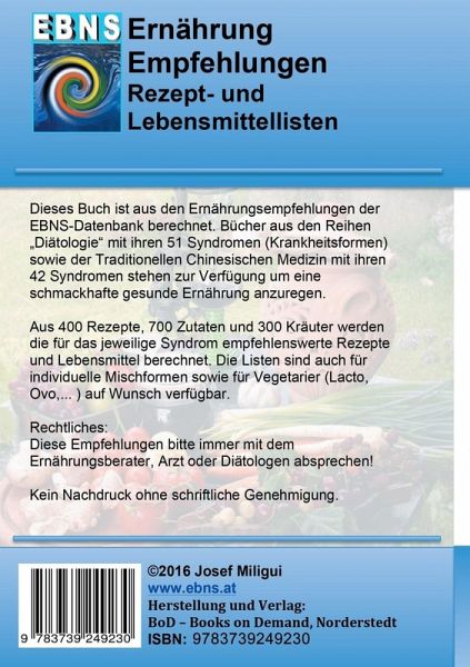 EBNS - Ernährungsberatung nach Syndromen - Rezepte- und Lebensmittellisten für die Unterstützung der schulmedizinischen Therapie für bei Hypertonie (Bluthochdruck). Harntreibende Lebensmittel, fettarme Ernährung, Gewichtsreduktion sofern Übergewicht besteht, weniger Salz. Vermeiden: Wenn Sie übergewichtig sind, sollte der Verzehr von Fetten/ (Vorsicht besonders bei versteckten Fetten z.B. in Wurst und Käse!), Kuchen/Gebäck, Süßwaren und Nüssen eingeschränkt werden. Alkohol und Nikotin meiden. Die Lebensmittel werden in Kategorien empfehlenswert, ja, weniger und nein angezeigt und helfen bei der Orientierung, wenn eigene Rezepte gekocht werden sollen.…mehr