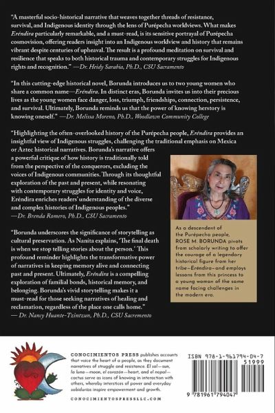 "A masterful socio-historical narrative that weaves together threads of resistance, survival, and Indigenous identity through the lens of Purépecha worldviews. What makes Eréndira particularly remarkable, and a must-read, is its sensitive portrayal of Purépecha cosmovision, offering readers insight into an Indigenous worldview and history that remains vibrant despite centuries of upheaval. The result is a profound meditation on survival and resilience that speaks to both historical trauma and contemporary struggles for Indigenous rights and recognition." -Dr. Heidy Sarabia, Ph.D., CSU Sacramento "In this cutting-edge historical novel, Borunda introduces us to two young women who share a common name-Eréndira. In distinct eras, Borunda invites us into their precious lives as the young women face danger, loss, triumph, friendships, connection, persistence, and survival. Ultimately, Borunda reminds us that the power of knowing herstory is knowing oneself." -Dr. Melissa Moreno, Ph.D., Woodlawn Community College "Highlighting the often-overlooked history of the Purépecha people, Eréndira provides an insightful view of Indigenous struggles, challenging the traditional emphasis on Mexica or Aztec historical narratives. Borunda's narrative offers a powerful critique of how history is traditionally told from the perspective of the conquerors, excluding the voices of Indigenous communities. Through its thoughtful exploration of the past and present, while resonating with contemporary struggles for identity and voice, Eréndira enriches readers' understanding of the diverse and complex histories of Indigenous peoples. -Dr. Brenda Romero, Ph.D., CSU Sacramento "Borunda underscores the significance of storytelling as cultural preservation. As Naníta explains, 'The final death is when we stop telling stories about the person.' This profound reminder highlights the transformative power of narratives in keeping memory alive and connecting past and present. Ultimately, Eréndira is a compelling exploration of familial bonds, historical memory, and belonging. Borunda's vivid storytelling makes it a must-read for those seeking narratives of healing and reclamation, regardless of the place one calls home. - Dr. Nancy Huante-Tzintzun, Ph.D., CSU Sacremento