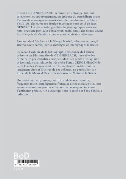 Ernest (de) GENGENBACH, séminariste défroqué, fut un épigone du surréalisme avant d'écrire des ouvrages satanistes sous le pseudonyme de Jehan SYLVIUS, des ouvrages érotico-mystiques sous celui de Jean GENBACH et des autobiographies hagiographiques sous celui de Ernest (de) GENGENBACH. Passant "de Satan à la Vierge Marie", selon ses termes, il alterna écrits sacrilèges et témoignages mariaux. Ce second volume de la bibliographie raisonnée de l'auteur présente un Dictionnaire de GENGENBACH, une table des principales personnalités évoquées dans ses écrits ainsi qu'une présentation analytique du Fonds GENGENBACH avec de très nombreux inédits, largement cités et illustrés, en particulier son Rituel de la Messe d'or et son scénario Le Moine et la Sirène.Un auteur surprenant qui fit scandale avant-guerre, fréquenta toute l'intelligentsia française athée mais aussi entretint une longue correspondance avec d'éminents prélats, un auteur qui sent le souffre et l'eau bénite, à redécouvrir.