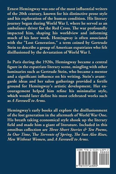Ernest Hemingway was one of the most influential writers of the 20th century, known for his distinctive prose style and his exploration of the human condition. His literary journey began during World War I, where he served as an ambulance driver for the Red Cross. The war profoundly impacted him, shaping his worldview and informing much of his later work. Hemingway is often associated with the "Lost Generation," a term coined by Gertrude Stein to describe a group of American expatriates who felt disillusioned by the devastation of World War I. In Paris during the 1920s, Hemingway became a central figure in the expatriate literary scene, mingling with other luminaries such as Gertrude Stein, who became a mentor and a significant influence on his writing. Stein's avant-garde ideas and her salon gatherings provided a fertile ground for Hemingway's artistic development. Her encouragement helped him refine his minimalist style, which would later define his most celebrated works such as A Farewell to Arms. Hemingway's early books all explore the disillusionment of the lost generation in the aftermath of World War One. His breath taking economical style shook up the literary field and made him a giant of literature. Included in this omnibus collection are Three Short Stories & Ten Poems, In Our Time, The Torrents of Spring, The Sun Also Rises, Men Without Women, and A Farewell to Arms.