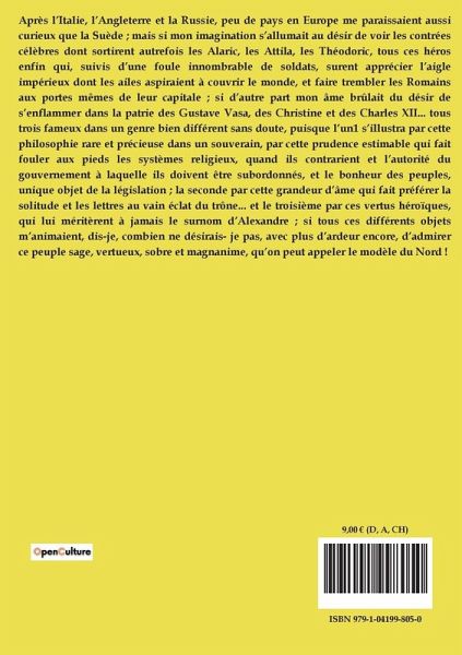 Après l¿Italie, l¿Angleterre et la Russie, peu de pays en Europe me paraissaient aussi curieux que la Suède ; mais si mon imagination s¿allumait au désir de voir les contrées célèbres dont sortirent autrefois les Alaric, les Attila, les Théodoric, tous ces héros enfin qui, suivis d¿une foule innombrable de soldats, surent apprécier l¿aigle impérieux dont les ailes aspiraient à couvrir le monde, et faire trembler les Romains aux portes mêmes de leur capitale ; si d¿autre part mon âme brûlait du désir de s¿enflammer dans la patrie des Gustave Vasa, des Christine et des Charles XII... tous trois fameux dans un genre bien différent sans doute, puisque l¿un1 s¿illustra par cette philosophie rare et précieuse dans un souverain, par cette prudence estimable qui fait fouler aux pieds les systèmes religieux, quand ils contrarient et l¿autorité du gouvernement à laquelle ils doivent être subordonnés, et le bonheur des peuples, unique objet de la législation ; la seconde par cette grandeur d¿âme qui fait préférer la solitude et les lettres au vain éclat du trône... et le troisième par ces vertus héroïques, qui lui méritèrent à jamais le surnom d¿Alexandre ; si tous ces différents objets m¿animaient, dis-je, combien ne désirais- je pas, avec plus d¿ardeur encore, d¿admirer ce peuple sage, vertueux, sobre et magnanime, qüon peut appeler le modèle du Nord !