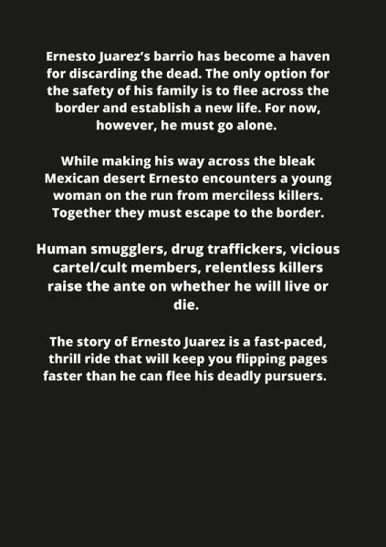 Ernesto Juarez's barrio has become a haven for discarding the dead. The only viable option to assure safety for his family is to cross the border and find a better life; but for now, he must go it alone. On his way north he discovers he's not the only one who has undertaken the dangerous journey. An unexpected encounter with young Elena Sanchez turns their journey into a life or death situation. Human traffickers, drug smugglers, cultish cartel members, relentless killers and a flight through the rugged wilderness raises the ante on whether they will live or die before they safely reach their destination on the American side. With an unexpected ending, the story of Ernesto Juarez is a fast-paced, thrill ride that will keep you turning pages faster than Ernesto can flee from his murderous pursuers.