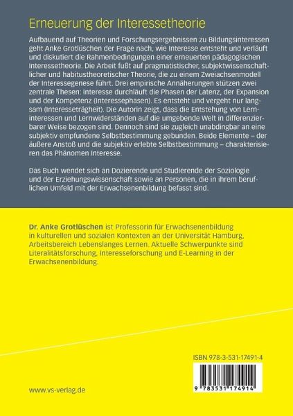 Aufbauend auf Theorien und Forschungsergebnissen zu Bildungsinteressen geht Anke Grotlüschen der Frage nach, wie Interesse entsteht und verläuft und diskutiert die Rahmenbedingungen einer erneuerten pädagogischen Interessetheorie. Die Arbeit fußt auf pragmatistischer, subjektwissenschaftlicher und habitustheoretischer Theorie, die zu einem Zweiachsenmodell der Interessegenese führt. Drei empirische Annäherungen stützen zwei zentrale Thesen: Interesse durchläuft die Phasen der Latenz, der Expansion und der Kompetenz (Interessephasen). Es entsteht und vergeht nur langsam (Interesseträgheit). Die Autorin zeigt, dass die Entstehung von Lerninteressen und Lernwiderständen auf die umgebende Welt in differenzierbarer Weise bezogen sind. Dennoch sind sie zugleich unabdingbar an eine subjektiv empfundene Selbstbestimmung gebunden. Beide Elemente - der äußere Anstoß und die subjektiv erlebte Selbstbestimmung - charakterisieren das Phänomen Interesse.