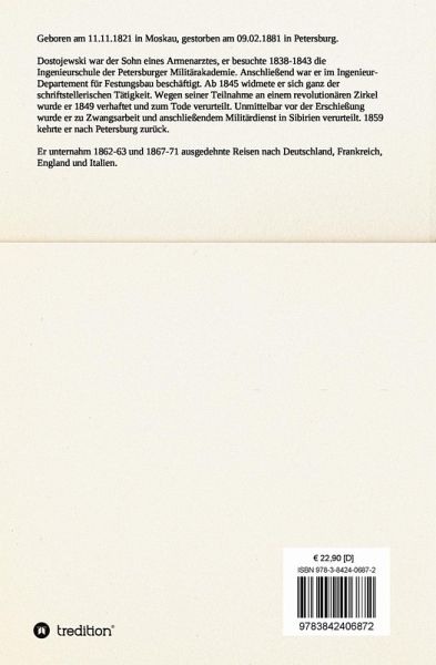 Geboren am 11.11.1821 in Moskau, gestorben am 09.02.1881 in Petersburg. Dostojewski war der Sohn eines Armenarztes, er besuchte 1838-1843 die Ingenieurschule der Petersburger Militärakademie. Anschließend war er im Ingenieur-Departement für Festungsbau beschäftigt. Ab 1845 widmete er sich ganz der schriftstellerischen Tätigkeit. Wegen seiner Teilnahme an einem revolutionären Zirkel wurde er 1849 verhaftet und zum Tode verurteilt. Unmittelbar vor der Erschießung wurde er zu Zwangsarbeit und anschließendem Militärdienst in Sibirien verurteilt. 1859 kehrte er nach Petersburg zurück. Er unternahm 1862-63 und 1867-71 ausgedehnte Reisen nach Deutschland, Frankreich, England und Italien.