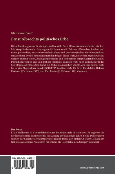 Die Abhandlung versucht, die spektakuläre Wahl Ernst Albrechts zum niedersächsischen Ministerpräsidenten im Landtag am 15. Januar und 6. Februar 1976 zu beschreiben und unter politischen, sozialwissenschaftlichen und psychologischen Gesichtspunkten einzuordnen. Die bis heute andauernden Folgen dieser Wahl, die wie ein Mythos wirken, werden anhand vieler Zeitzeugengespräche und Einblicke in interne Akten beleuchtet. Politikhistorisch ist dies von großem Interesse, da diese Wahl nach dem Rücktritt des Ministerpräsidenten Alfred Kubel nur deshalb so ausgehen konnte, weil in geheimer Wahl bis zu vier Abgeordnete aus der SPD/FDP-Koalition nicht für ihren Kandidaten Helmut Kasimier (15. Januar 1976) oder Karl Ravens (6. Februar 1976) stimmten.