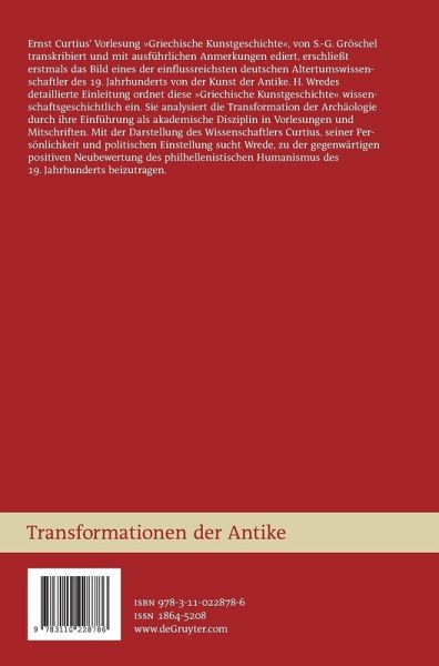 Die Vorlage der Griechischen Kunstgeschichte von Ernst Curtius in der Vorlesungsmitschrift seines Schülers Wilhelm Gurlitt, später Ordinarius für Archäologie in Graz, ergänzt durch die Mitschrift Eduard Hillers, später Ordinarius für Klassische Philologie in Halle/S., aus dem Wintersemester 1864/65 in Göttingen erschließt erstmalig das Bild eines der einflussreichsten deutschen Altertumswissenschaftlers des 19. Jahrhunderts von der Kunst der Antike. Die Mitschrift, von S.-G. Gröschel transkribiert und mit einem Anmerkungsapparat versehen, zeichnet eine von pädagogischem und patriotischem Impetus getragene, noch stark philologisch geprägte, in eine Systematik und einen geschichtlichen Teil gegliederte Darstellung griechischer und römischer Kunst, deren Entwicklung beispielgebend Athen geprägt habe. H. Wredes Untersuchungen der Geschichte der Archäologievorlesung als Nukleus zur Genese der Forschungsuniversität, zu Curtius' Person, seiner politischen nationalliberalen Einstellung und seinem Philhellenismus, zu seinen Studenten Wilhelm Gurlitt und Eduard Hiller sowie die ausführliche Erklärung der Vorlesung dienen nicht nur als notwendige Hintergrundinformation, sondern belegen die Bedeutung der Griechischen Kunstgeschichte für Zeit- und Archäologiegeschichte.