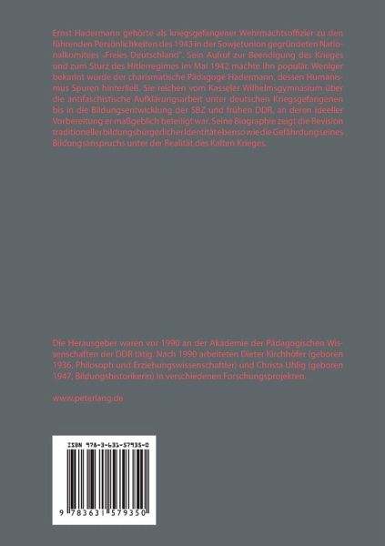 Ernst Hadermann gehörte als kriegsgefangener Wehrmachtsoffizier zu den führenden Persönlichkeiten des 1943 in der Sowjetunion gegründeten Nationalkomitees "Freies Deutschland". Sein Aufruf zur Beendigung des Krieges und zum Sturz des Hitlerregimes im Mai 1942 machte ihn populär. Weniger bekannt wurde der charismatische Pädagoge Hadermann, dessen Humanismus Spuren hinterließ. Sie reichen vom Kasseler Wilhelmsgymnasium über die antifaschistische Aufklärungsarbeit unter deutschen Kriegsgefangenen bis in die Bildungsentwicklung der SBZ und frühen DDR, an deren ideeller Vorbereitung er maßgeblich beteiligt war. Seine Biographie zeigt die Revision traditioneller bildungsbürgerlicher Identität ebenso wie die Gefährdung seines Bildungsanspruchs unter der Realität des Kalten Krieges.