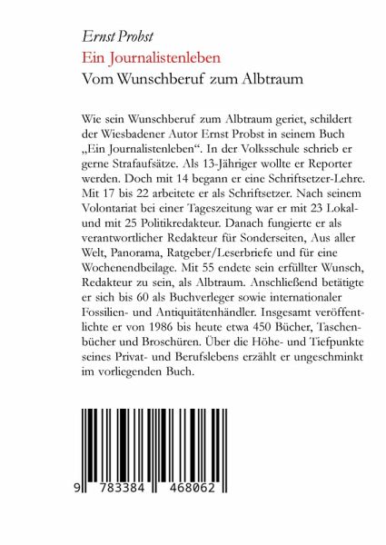 Wie sein Wunschberuf zum Albtraum geriet, schildert der Wiesbadener Autor Ernst Probst in seinem Buch "Ein Journalistenleben". In der Volksschule schrieb er gerne Strafaufsätze. Als 13-Jähriger wollte er Reporter werden. Doch mit 14 begann er eine Schriftsetzer-Lehre. Mit 17 bis 22 Jahren arbeitete er als Schriftsetzer. Nach seinem Volontariat bei einer Tageszeitung war er mit 23 Lokalredakteur und mit 25 Politikredakteur. Danach fungierte er als verantwortlicher Redakteur für Sonderseiten, Aus aller Welt, Ratgeber/Leserbriefe und für eine Wochenendbeilage. Mit 55 Jahren endete sein erfüllter Wunsch, Redakteur zu sein, als Albtraum. Anschließend betätigte er sich bis 60 als Buchverleger sowie internationaler Fossilien- und Antiquitätenhändler. Insgesamt veröffentlichte er von 1986 bis heute etwa 450 Bücher, Taschenbücher und Broschüren. Über die Höhe- und Tiefpunkte seines Privat- und Berufslebens erzählt er ungeschminkt im vorliegenden Buch.