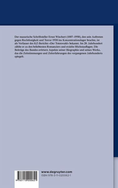 Der masurische Schriftsteller Ernst Wiechert (1887 1950), den sein Auftreten gegen Rechtlosigkeit und Terror 1938 ins Konzentrationslager brachte, ist als Verfasser des KZ-Berichts "Der Totenwald" bekannt. Im 20. Jh. zählte er zu den beliebtesten Romanciers und erzielte Höchstauflagen. Die Beiträge des Bandes erörtern Aspekte seiner Biographie und seines Werks, das die Zeitstimmungen und Zeiterfahrungen des vergangenen Jahrhunderts spiegelt.