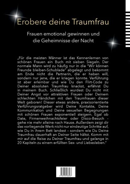 Für die meisten Männer ist das Kennenlernen von schönen Frauen ein Buch mit sieben Siegeln. Der normale Mann wird zu häufig nur in die "Wir können Freunde bleiben-Schublade" abgelegt und bekommt am Ende nicht die Partnerin, die er haben will, sondern nur jene, die er kriegen konnte.Verführung ist aber erlernbar und wie du den Flirt-Code zu Deiner absoluten Traumfrau knackst, erfährst Du in meinem Buch. Schließlich wurdest Du nicht mit Deiner Angst vor attraktiven Frauen oder Deinem schlechten Händchen mit den Traumfrauen dieser Welt geboren! Dieser etwas andere, praxisorientierte Verführungsratgeber wird Deine Kontakte, Deine Kommunikation und Deine sexuellen Begegnungen mit schönen Frauen exponentiell steigern. Außerdem zeigt dir das vorliegende Werk nicht nur eindeutige Schritte auf, wie Du in ihrem Bett landest - sondern wie Du Deine Traumfrau dauerhaft an Deiner Seit hältst. Komm mit mir auf die Reise zu Deiner Traumfrau und gelange in 20 Kapiteln zu einem erfüllten Sex- und Liebesleben.